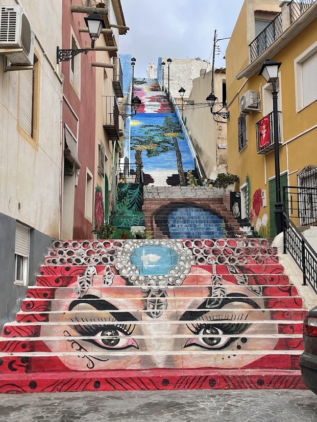 Een van de meest opvallende bezienswaardigheden van Abanilla zijn de kleurrijk beschilderde trappen, die met meer dan 180 treden recht omhoog door het oude centrum lopen. De treden zijn versierd met schilderingen die het leven in Abanilla, haar inwoners en de omliggende natuur uitbeelden. De klim voert je naar het imposante Heilig Hart van Jezus, een Christusbeeld van 4 meter hoog dat op een sokkel van 7 meter staat. Als je eenmaal boven bent, word je beloond met een panoramisch uitzicht dat op zichzelf al de moeite waard is.